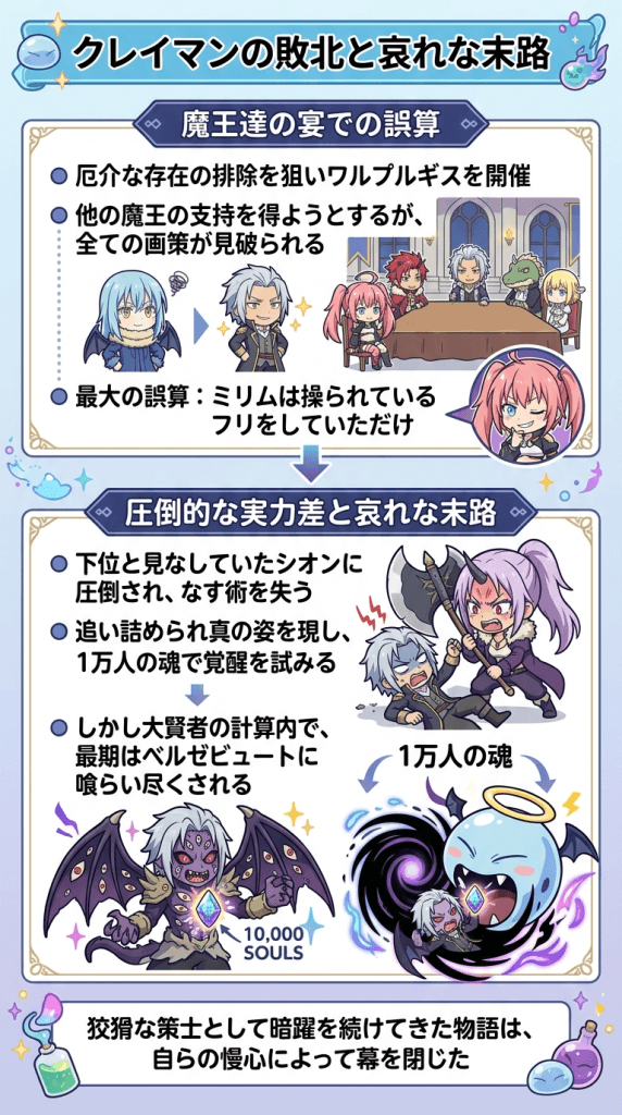 狡猾な策士として暗躍し続けた本編での物語は自らの過信によって幕を閉じることになります。