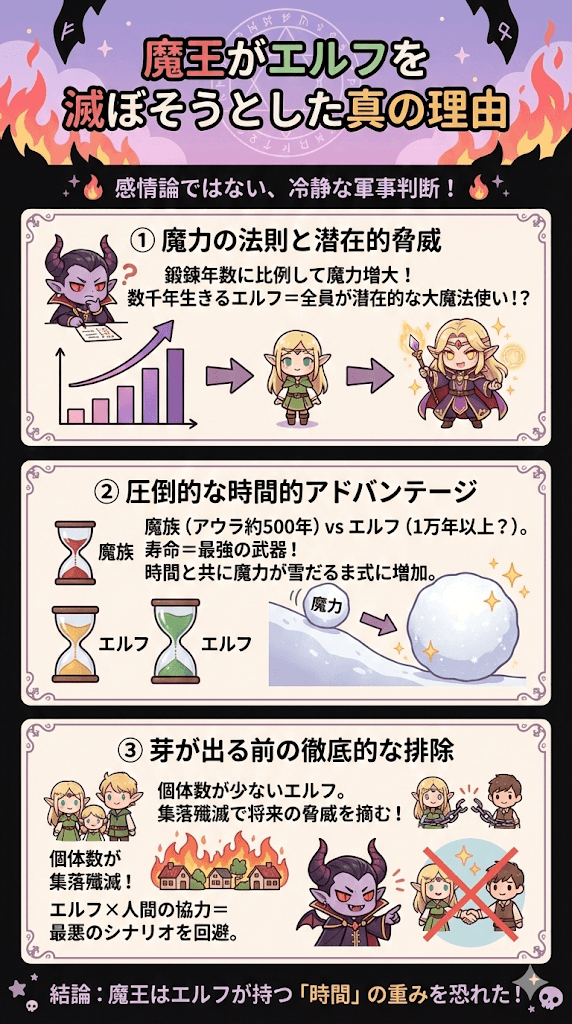 この圧倒的な時間的アドバンテージを恐れた魔王は、エルフがその潜在能力を開花させる前に、種そのものを絶やそうとしたのでしょう。