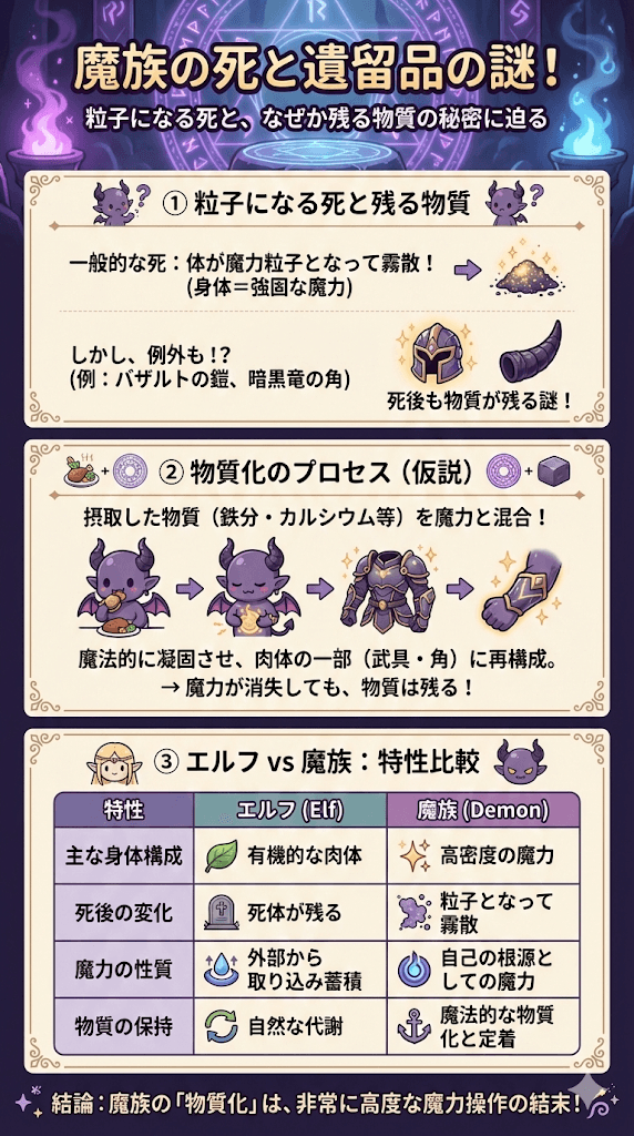 - 魔族の死において身体が消滅する法則と例外的に物質が残る理由