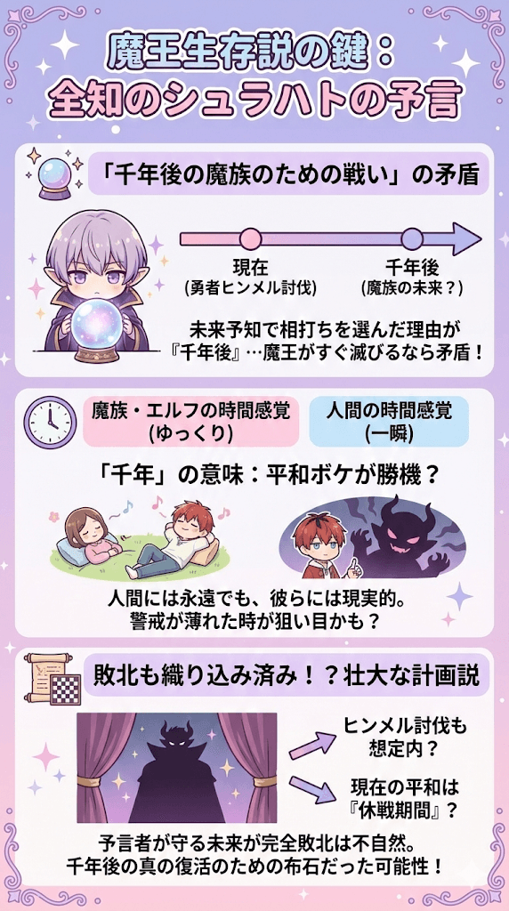 ここで論理的な矛盾が生じます。もし魔王がヒンメルたちによって数年後に完全に討伐され、魔族が滅びの道を歩むことが確定しているのなら、なぜシュラハトは「千年後」を見据えた布石を打つ必要があったのでしょうか。