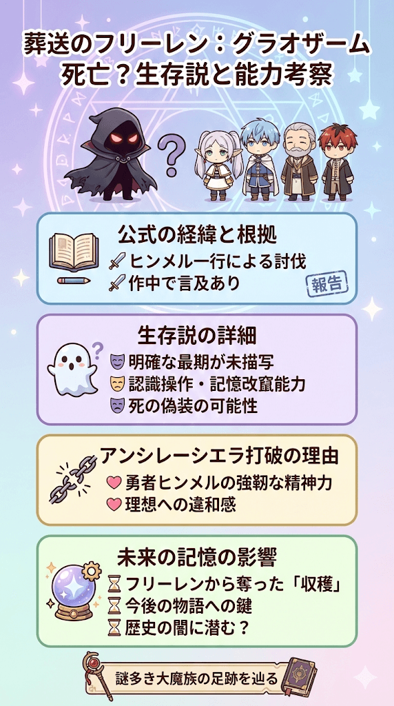 彼が本当に勇者ヒンメル一行によって討伐され、その命脈を絶たれたのか、あるいはその巧みな精神魔法を駆使して歴史の闇で生存しているのか、その真相は多くの読者を惹きつけてやみません。