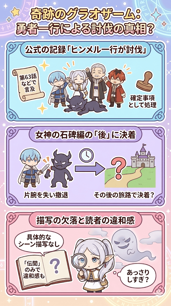 物語の構造上、魔王討伐という大業を成し遂げる過程で、主要な障壁である七崩賢は排除されているはずであり、そのリストにグラオザームの名があることは、彼が敗北したことを強く示唆しています。