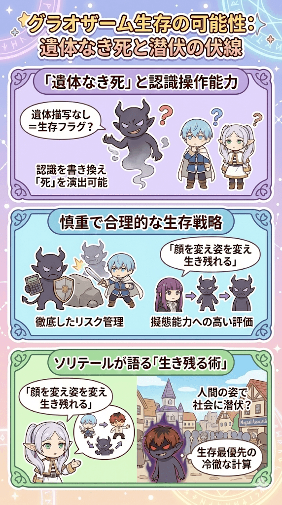 グラオザームの場合も例外ではなく、彼が確実に消滅した、あるいは遺体が確認されたという描写がない点が、生存説を支える最大の根拠となっています。