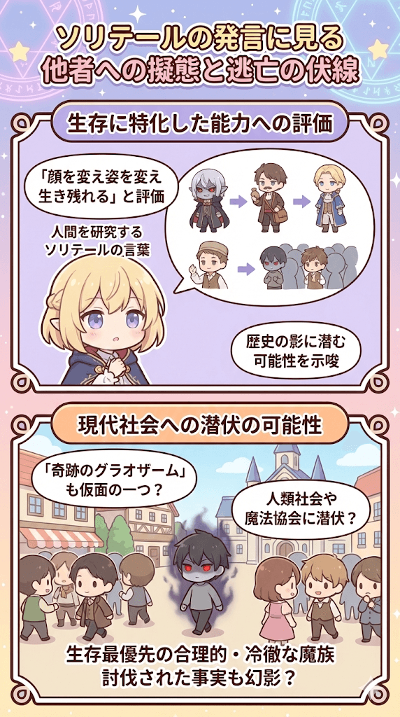 ソリテールが指摘した「生き残る術」としての擬態能力は、彼が名誉や誇りに固執する単なる戦闘狂ではなく、種の存続や自身の生存こそを最優先する、極めて合理的で冷徹な魔族であることを示しています。