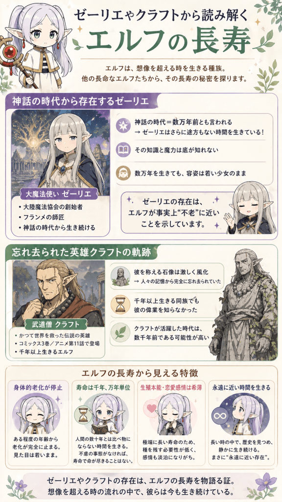 彼女の存在は、エルフという種族が事実上の不老に近い状態であることを強く示唆しています。