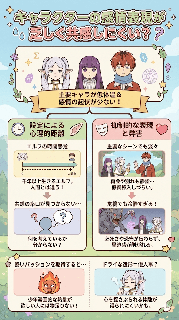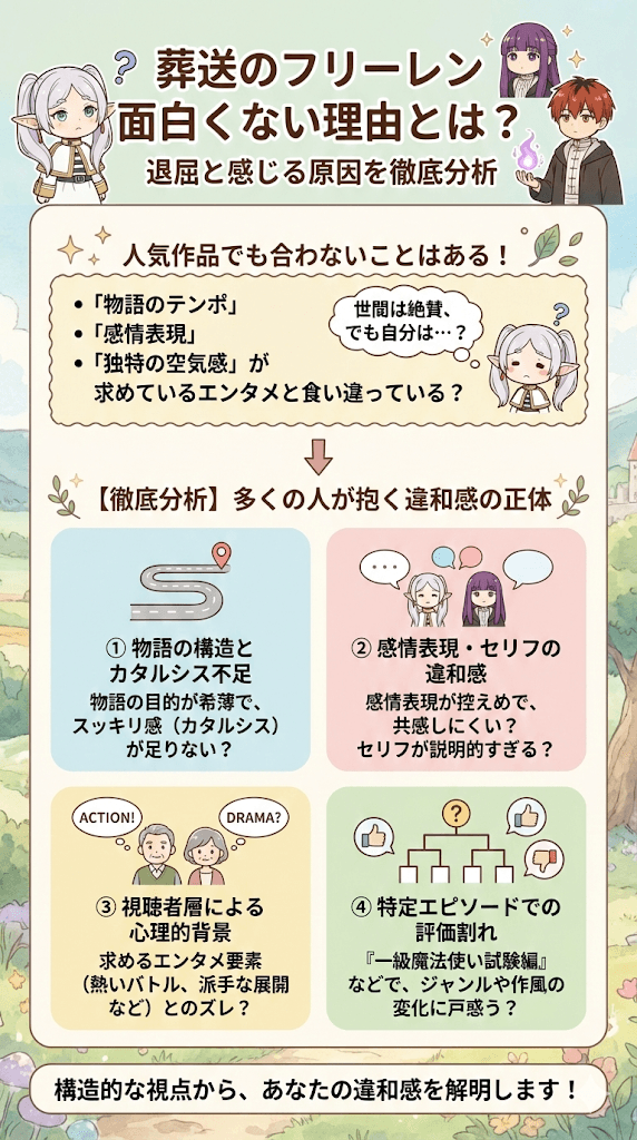 ここまで分析してきたように、葬送のフリーレン面白くないと感じる背景には、作品の構造的な特徴やテーマと、視聴者の好みとの間に明確な不一致が存在します。