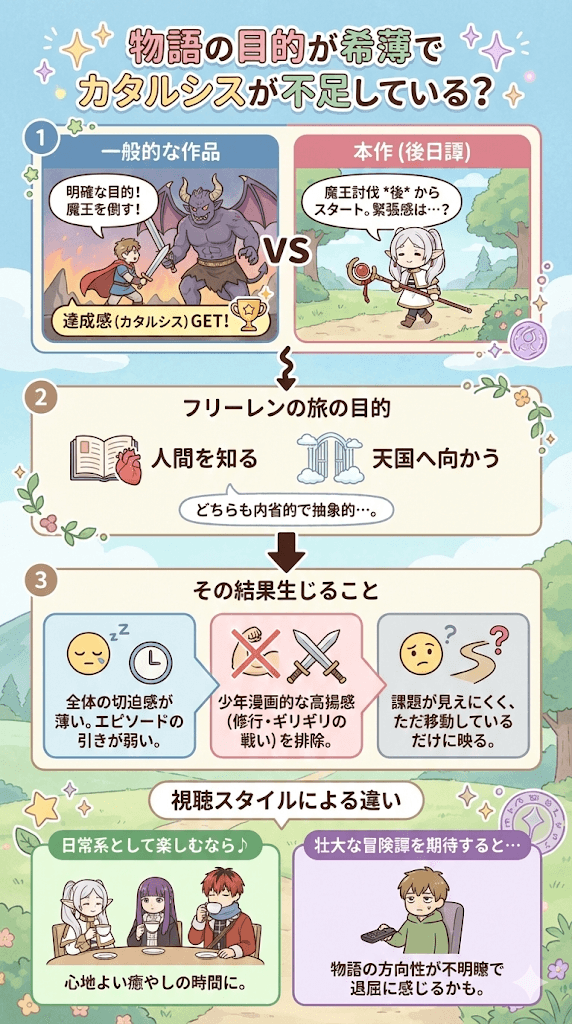 - 物語の目的が希薄でカタルシスが不足している