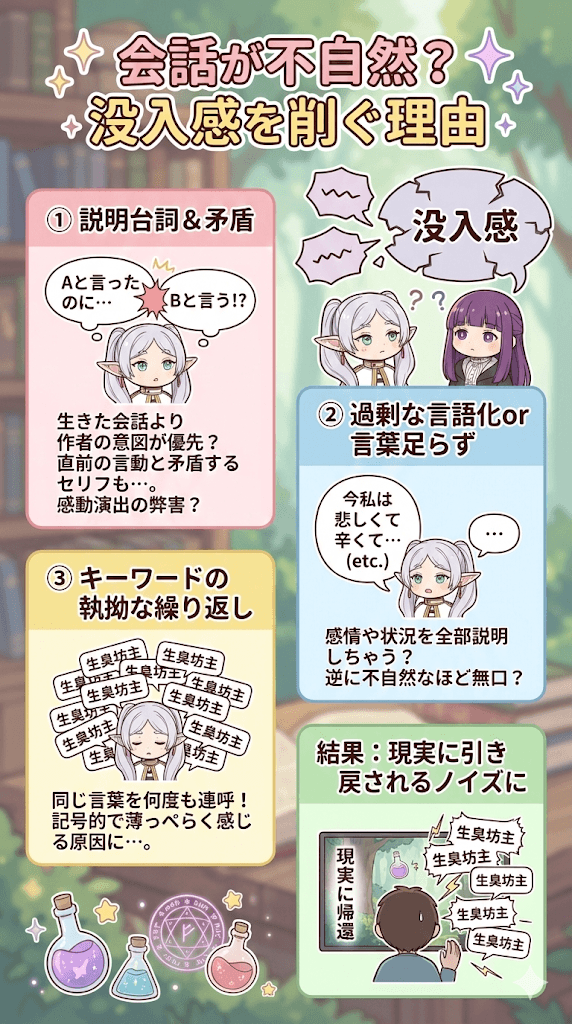 例えば、キャラクターが自身の感情や状況を過剰に言語化して説明してしまったり、逆に文脈上不自然なほど言葉足らずであったりする場面が散見されます。