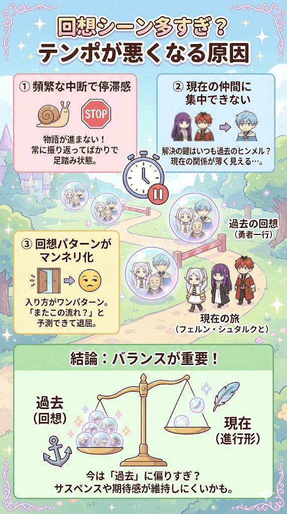 これにより、ストーリーが前に進んでいるという感覚が得られにくく、常に過去を振り返ってばかりいるような停滞感が生じます。