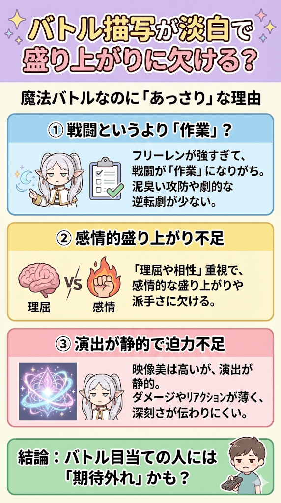 バトルを目当てに視聴を始めた層にとっては、この淡々とした戦闘描写は期待外れであり、作品全体を面白くないと感じさせる大きな要因となります。