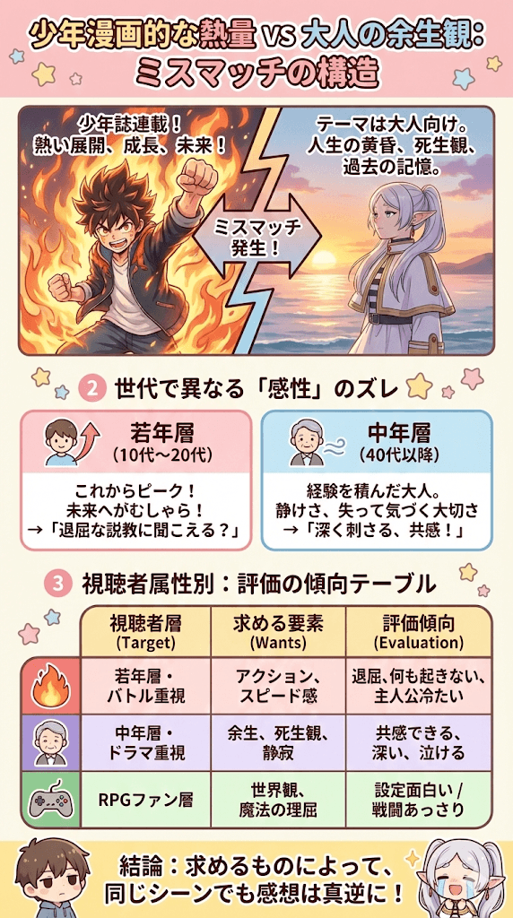 しかし、これから人生のピークを迎える10代や20代の視聴者、あるいは少年漫画らしい成長と勝利の物語を求めている層にとって、これらのテーマは実感を伴わない退屈な説教のように聞こえるかもしれません。