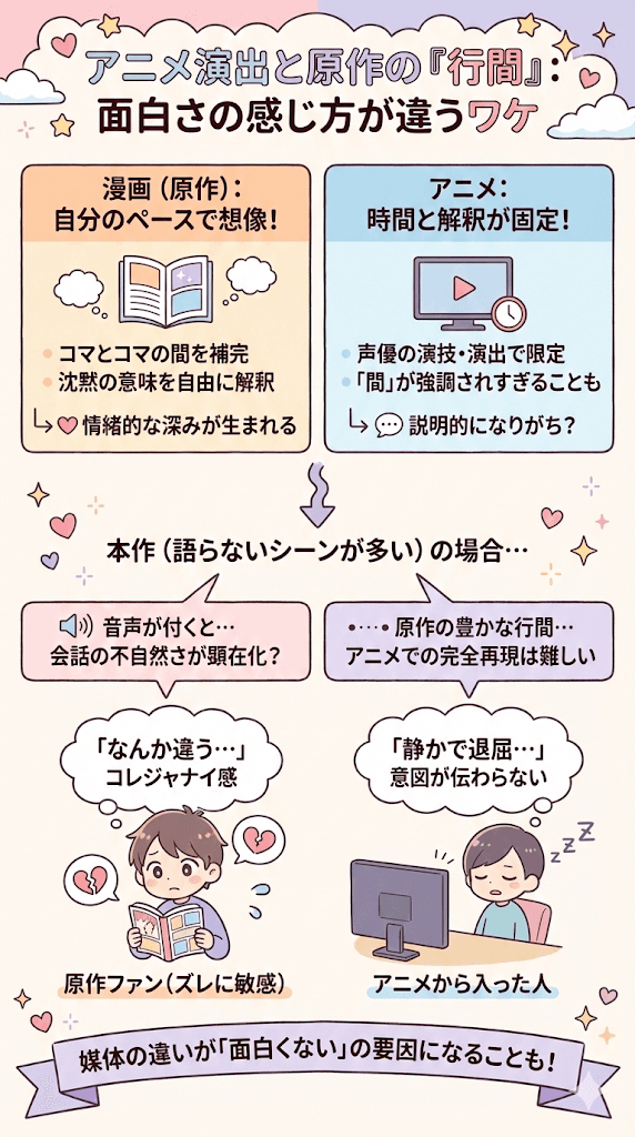 - アニメ化による「間」の固定化が、原作の行間を殺している場合がある