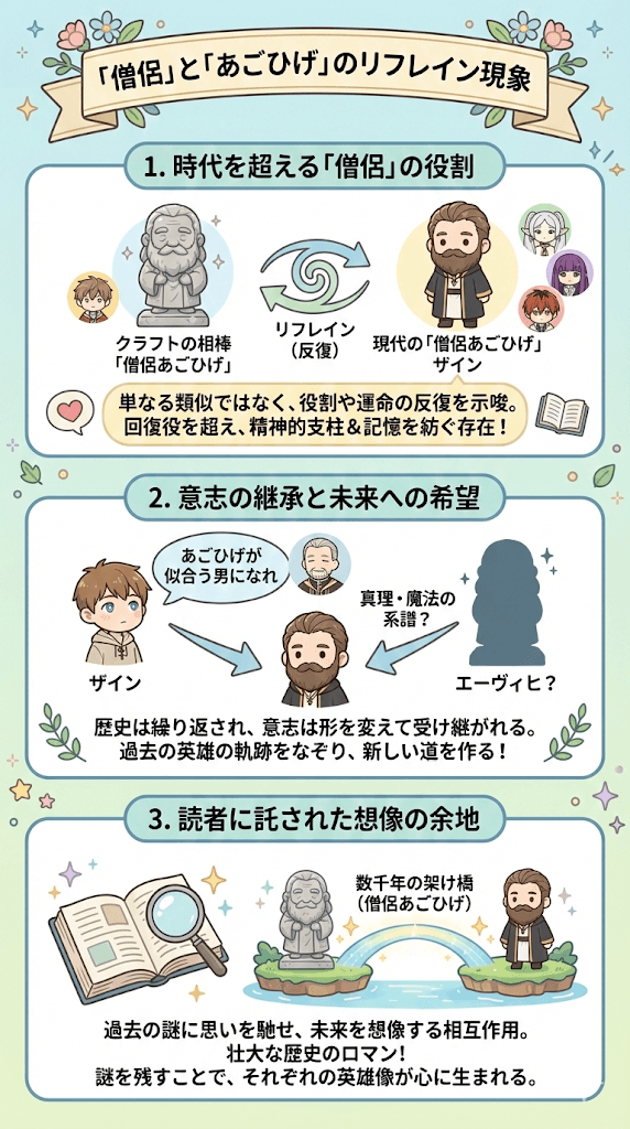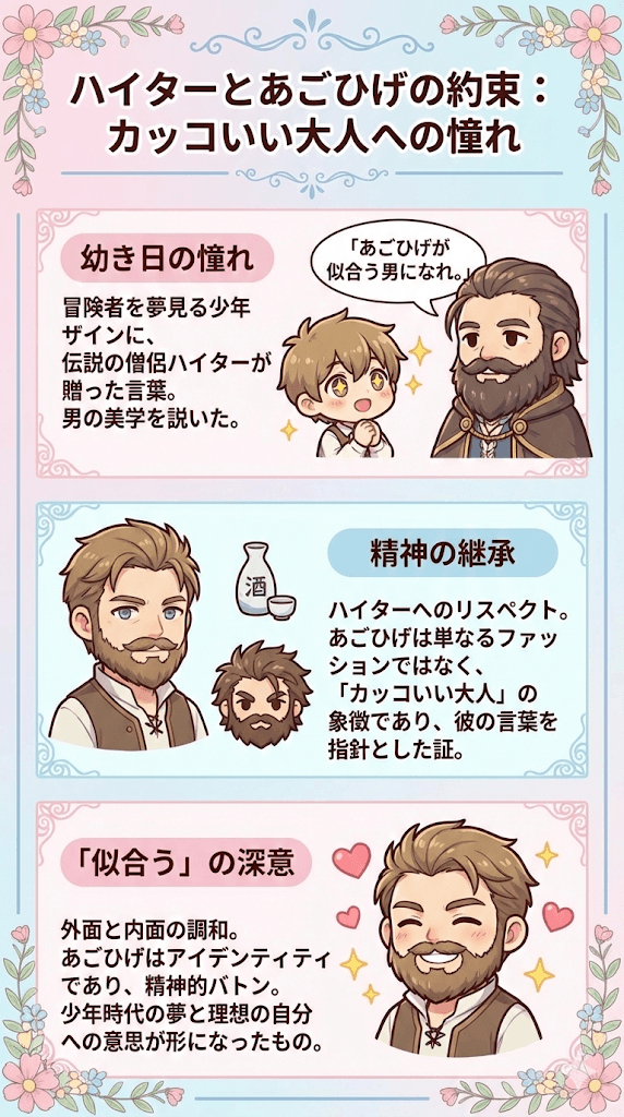 特に「あごひげ」という特徴的な記号は、勇者パーティーの僧侶ハイターからザインへと受け継がれる意志の象徴であり、同時に神話の時代に生きた英雄たちの忘れられた記憶を呼び覚ます鍵となっているのです。