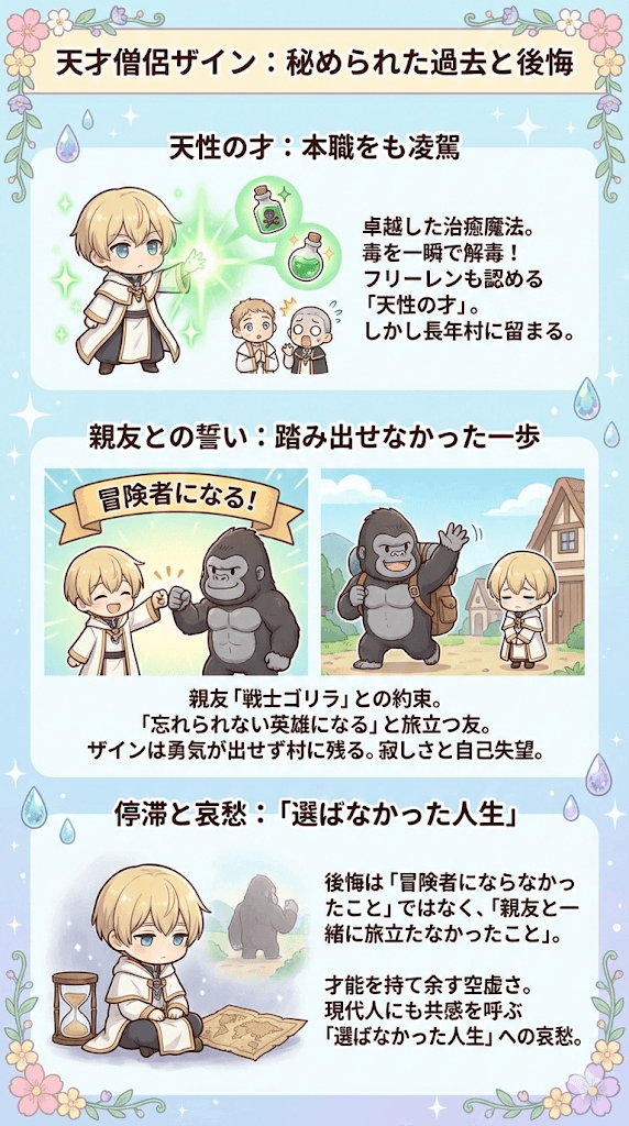 ヒンメルの死をきっかけに旅に出たフリーレンと同様に、ザインもまた、過去の選択に対する未練を抱えながら生きていました。