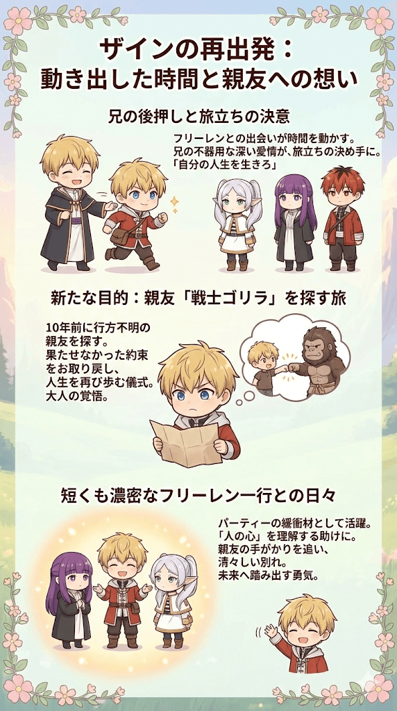- フリーレンとの旅を通じて、ザインは止まっていた自分の時間を動かす決意をした
