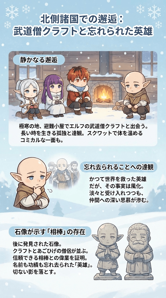 物語の中で、フリーレンたちは極寒の地、北側諸国のデッケ地方にある避難小屋で、エルフの武道僧(モンク)クラフトと出会います。