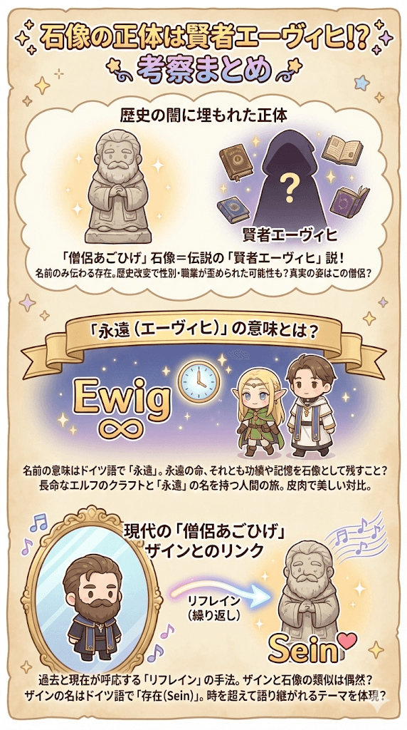 - 石像に刻まれた「僧侶あごひげ」の正体が賢者エーヴィヒである可能性
