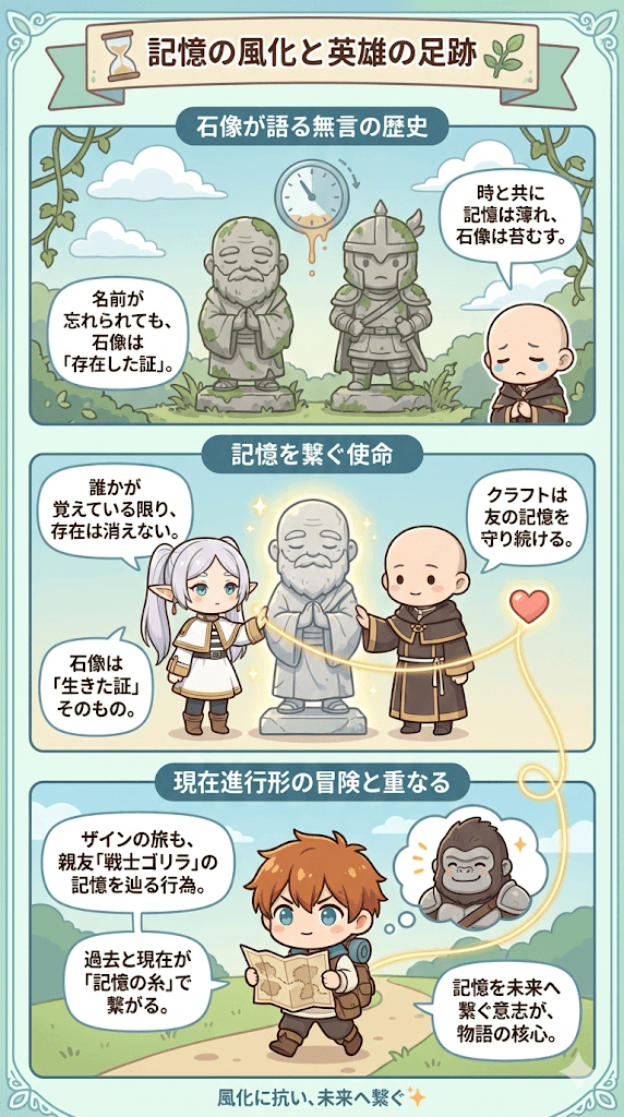 - クラフトと石像の関係は、長い時の中で風化していく記憶の儚さを象徴している