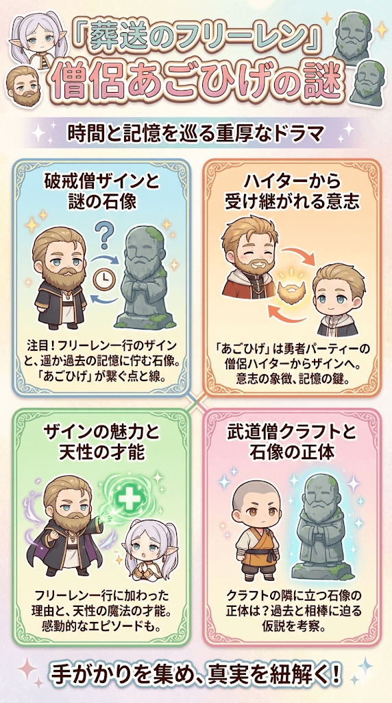 - 記事のポイントとして、「葬送のフリーレン 僧侶あごひげ」という言葉は、ザインと謎の石像の二つを指す