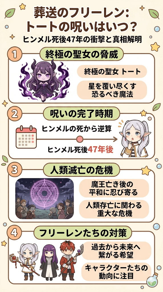 読者の中には、葬送のフリーレンのトートの呪いがいつ星を覆い尽くすのか、正確な時期や物語への影響を知りたいと考える方が少なくありません。