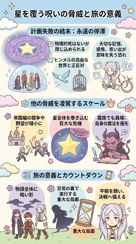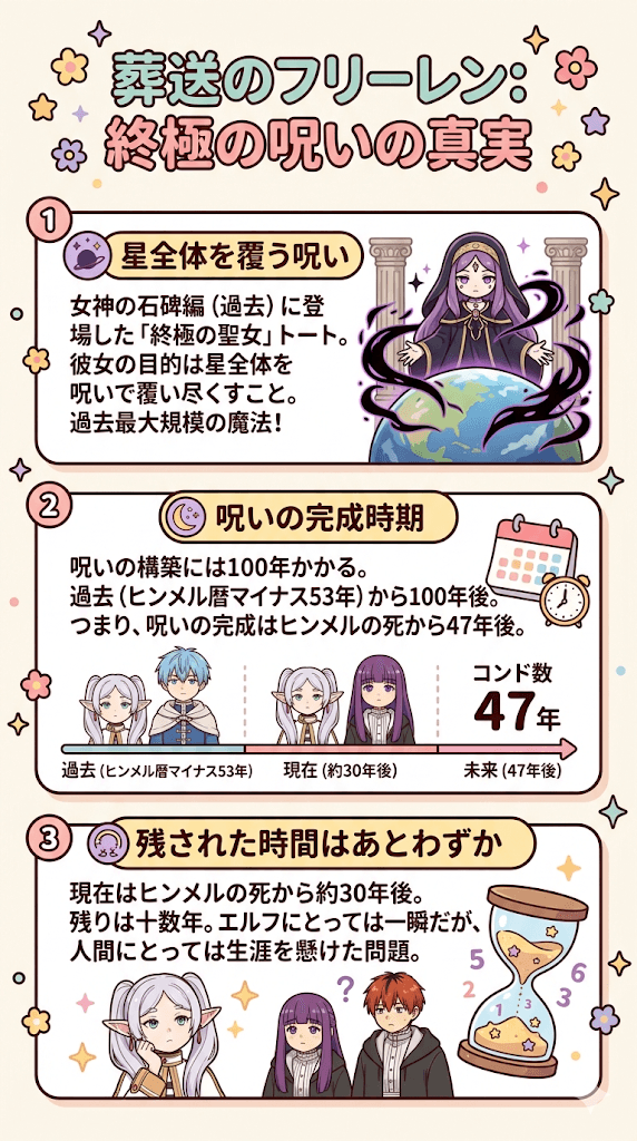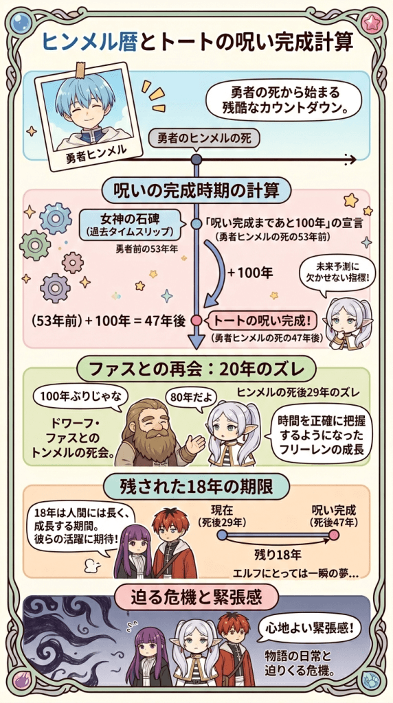 その結果、呪いが完成して星を覆うのは、勇者ヒンメルの死から47年後という明確な時期が導き出されます。