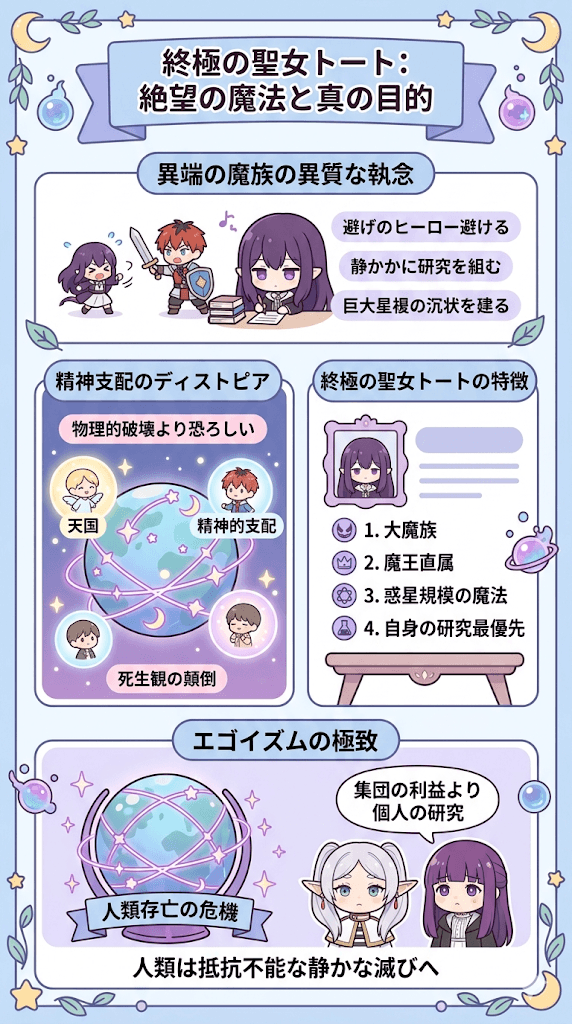戦いを好まず、ただ静かに星の裏側で魔法の研究と構築に没頭している姿は、不気味なほどの執念を感じさせます。