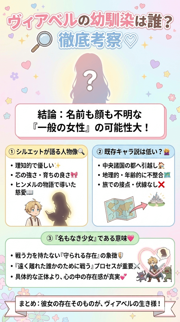 - ヴィアベルの好きな人は、29年前に別れた幼馴染の一般女性である可能性が高い