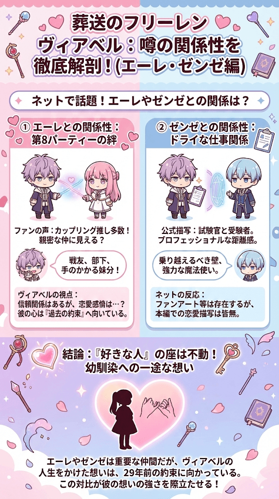 葬送のフリーレンのヴィアベルの好きな人について議論する際、ファンの間でしばしば話題に上がるのが、同じパーティメンバーであるエーレや、試験官であるゼンゼとの関係性です。