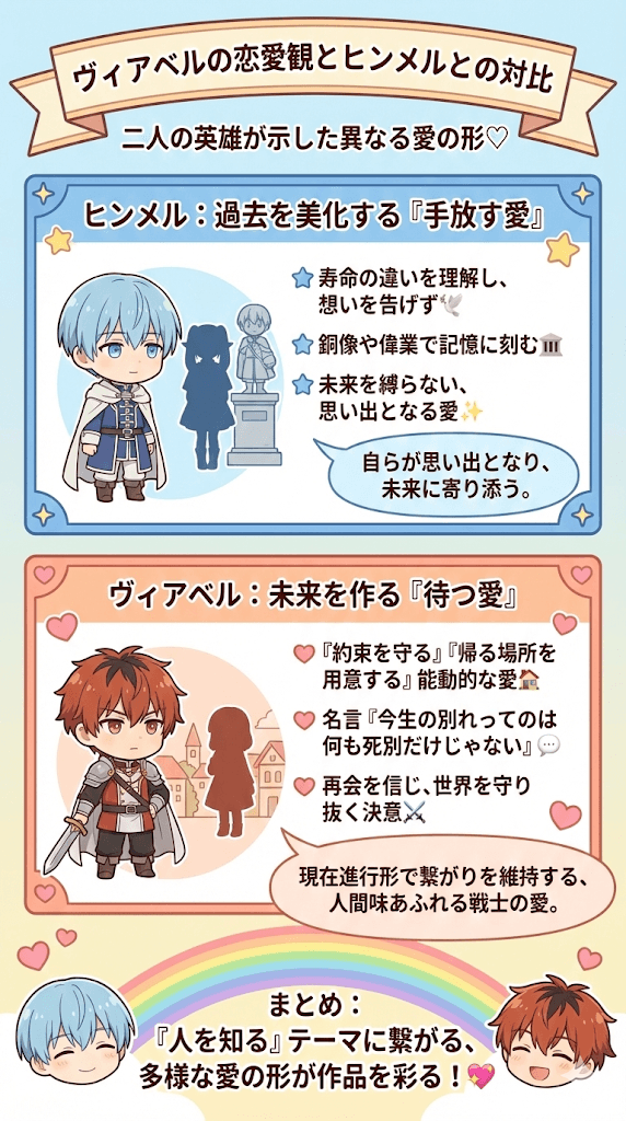 ヒンメルが「思い出」になることを選んだのに対し、ヴィアベルは「現在進行形」で相手との繋がりを維持しようとしています。