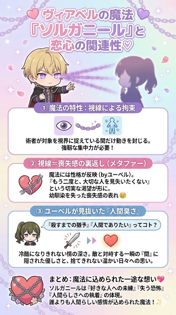 つまり、ソルガニールという魔法自体が、ヴィアベルの「好きな人への未練」や「失うことへの恐怖」、そして「人間らしさへの執着」を体現した伏線となっているのです。