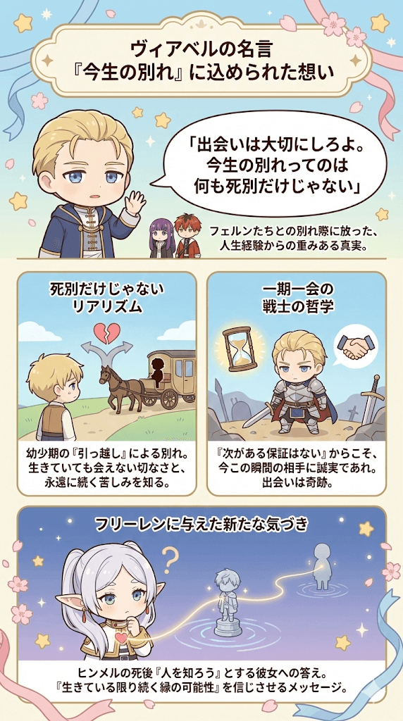 どちらの別れも等しく寂しいものですが、ヴィアベルの言葉は、生きている限り続く縁の可能性を信じさせてくれる、力強くも優しいメッセージなのです。