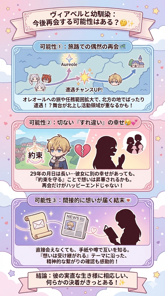 あるいは、直接的な再会は描かれずとも、彼女からの手紙や、彼女がヴィアベルの活躍を知る描写などが挿入されることで、間接的に想いが届くという結末も考えられます。