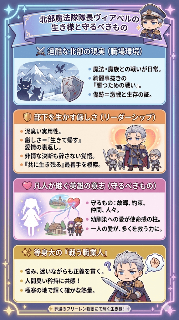 ヴィアベルの魅力は、彼が「待つだけの男」ではなく、過酷な現実の中で戦う「現場の指揮官」である点にあります。