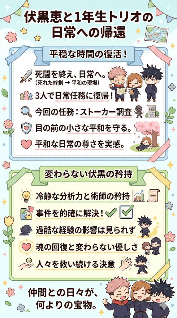 日常への帰還は、彼らが呪術師としての道を再び歩み始めた証でもあります。