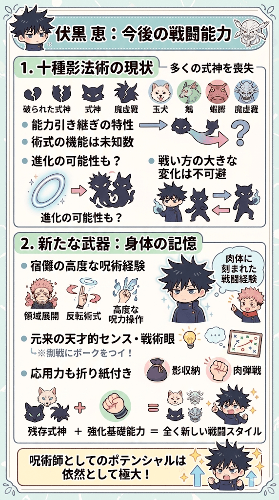 - 強力な術式は多くの式神を失ったものの肉体に残る戦闘経験が今後の強みとなる