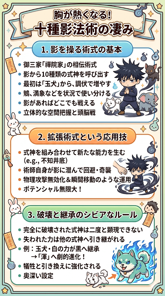 影を媒体にして十種類の相棒を呼び出すことができるこの術式は、御三家の一つである禪院家に相伝される非常に強力なものです。