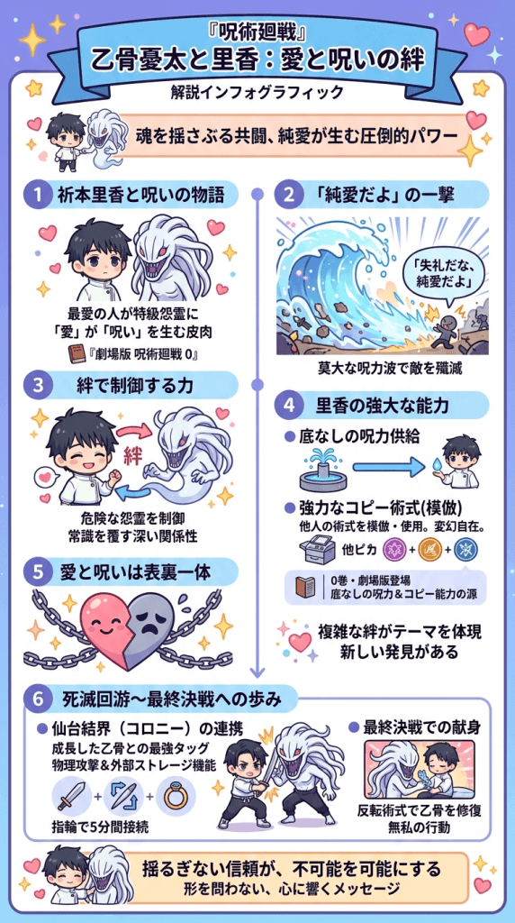 乙骨とリカの関係性は、呪いという負の感情から始まったものでありながら、最後には互いを思いやる純粋な愛へと昇華されました。