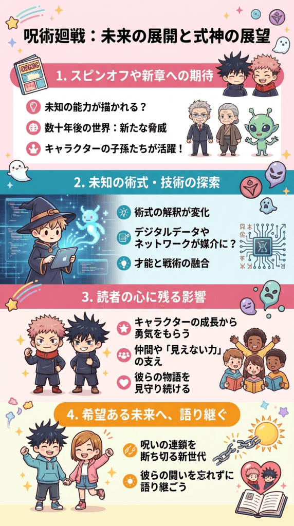 スピンオフ作品などで描かれる数十年後の世界において、呪術の概念がどのように変化しているのかも興味深いポイントです。