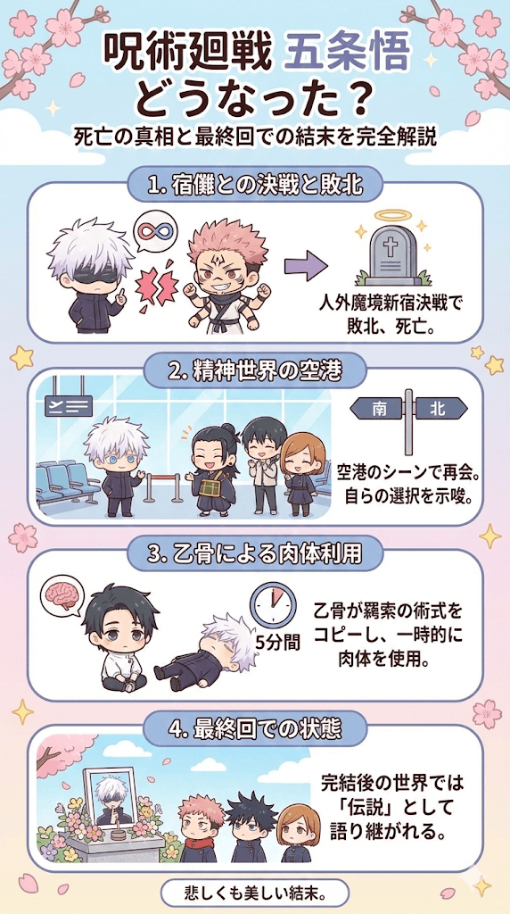 - 最終回および完結後の世界における五条悟の最終的な状態