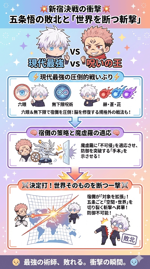 この「世界を断つ斬撃」こそが、五条悟の命を奪った直接的な原因であり、最強の術師が敗れ去る決定的な瞬間となったのです。
