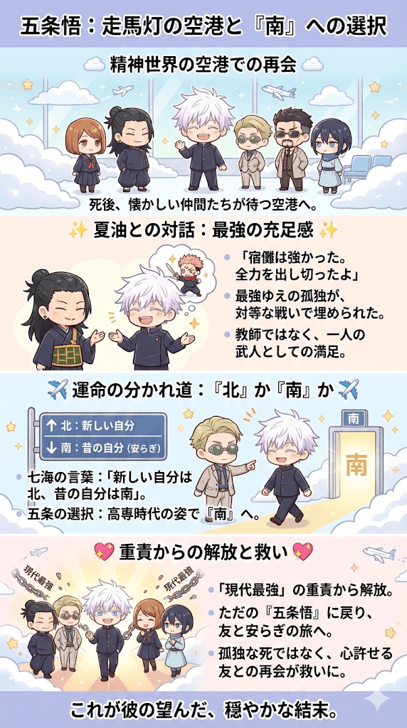 「南」を選ぶということは、呪術師としての重責、現代最強という肩書き、そして未来を背負う教師としての役割から解放され、ただの「五条悟」という一人の人間に戻り、安らぎを得ることを意味します。