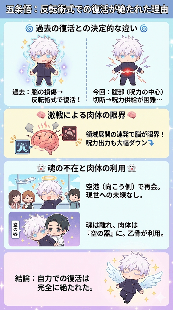 - 反転術式による復活は、肉体の損傷度合いと呪力枯渇、および魂の不在により不可能だった