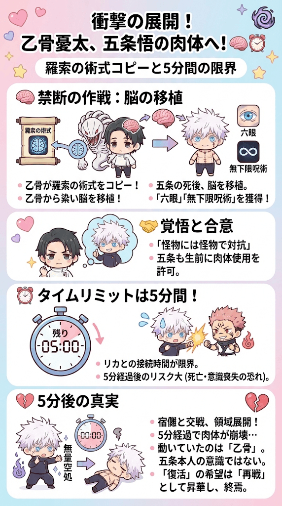 もし5分が経過した後、羂索の術式が維持できなければ、乙骨は死亡するか、あるいは五条の肉体の中で永遠に意識を失う恐れがありました。