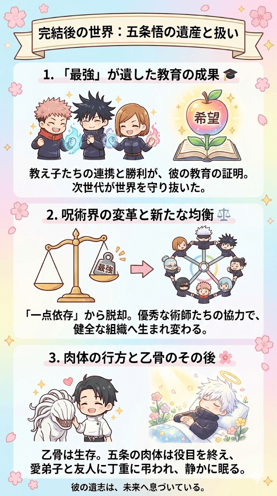彼という抑止力を失った世界は混沌とする可能性もありましたが、生き残った優秀な術師たちが協力し合うことで、より健全な組織へと生まれ変わろうとしています。