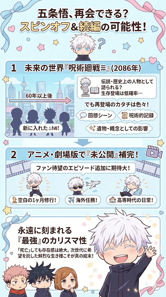 かつての宿儺が呪物として時代を超えたように、五条悟も何らかの形で未来に影響を及ぼす「遺物」や「概念」として登場する展開は十分にあり得ます。