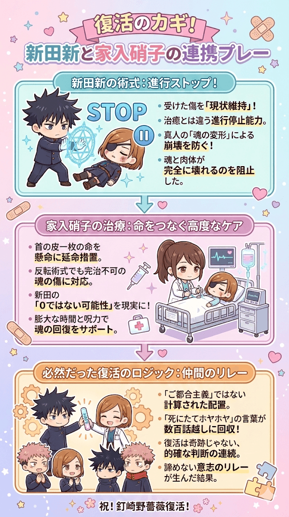 しかし、新田の術式によって傷の進行をその瞬間の状態で「停止」させたことが、結果として彼女の魂と肉体が完全に崩壊しきるのを防ぎました。