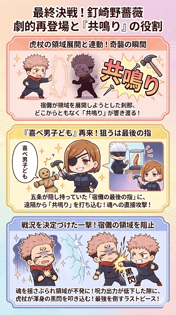 釘崎の復活と共鳴りは、単なるファンサービス的な再登場ではなく、最強の呪いの王を倒すためのラストピースとして、戦況を決定づける極めて重要な一手となったのです。