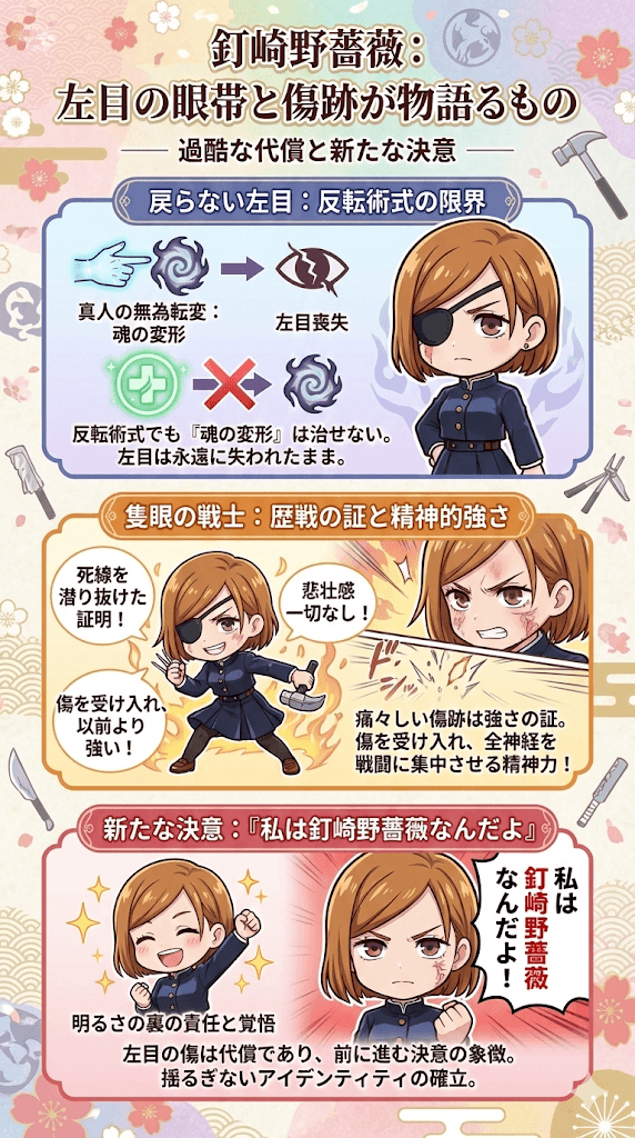 復活した釘崎野薔薇の左目には、黒い眼帯が巻かれていました。