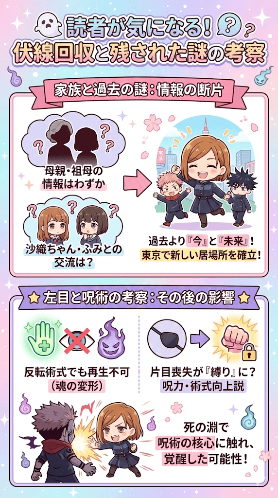 釘崎の復活により、物語の主要な謎の多くは決着を見ましたが、彼女の個人的な背景については、あえて語られなかった部分も残されています。