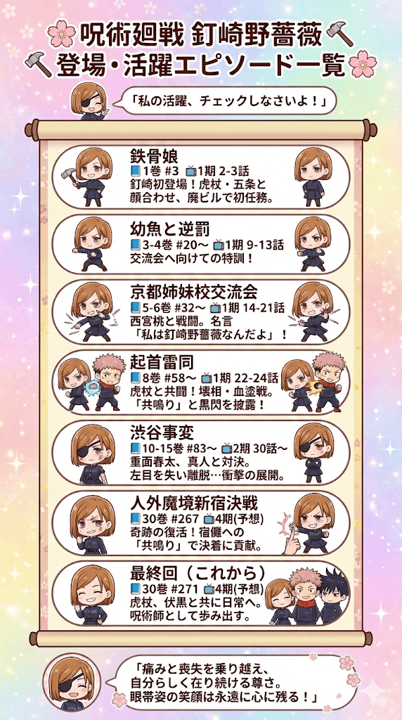以下の表は、アニメおよび原作漫画における釘崎野薔薇の主要な活躍エピソードをまとめたものです。